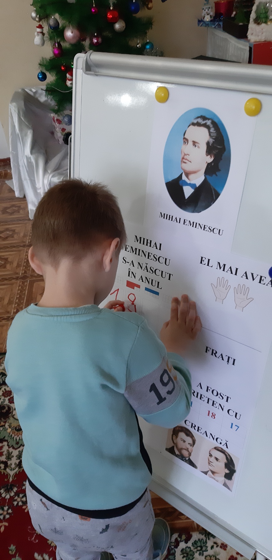 Copiii impreuna cu parintii, ghidati de scumpele educatoare, s-au adunat în miez de iarna să cinsteasca cu pietate memoria Luceafarului poieziei românești, care a sclipit deasupra lunii cu doua secole în urmă. La 15 ianuarie, in ziua de nastere a Marelui Poet Mihai Eminescu, pășim cu candela iubirii aprinsă în sufletele noastre în cel de al treilea mileniu al nemuririi sale.